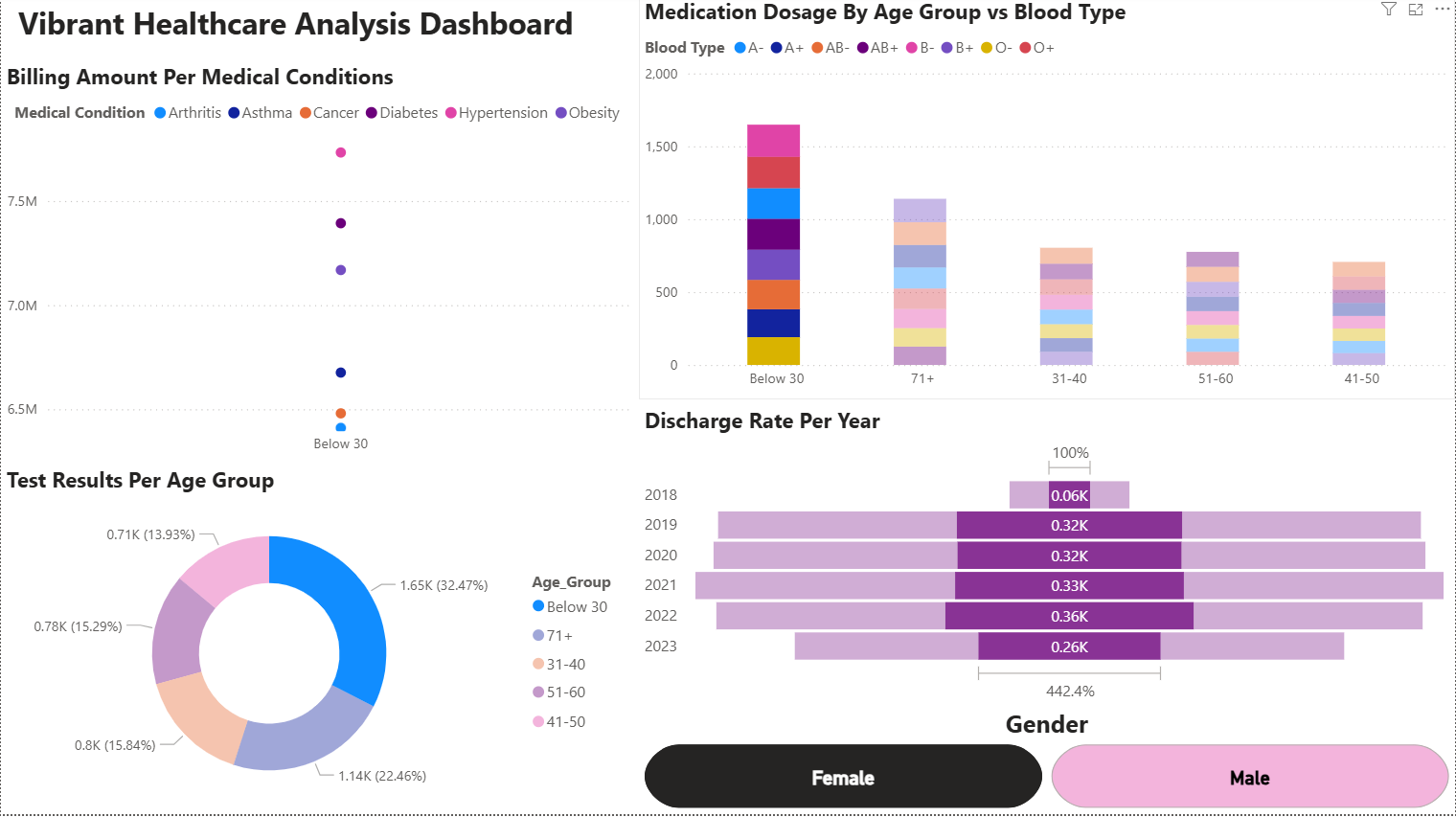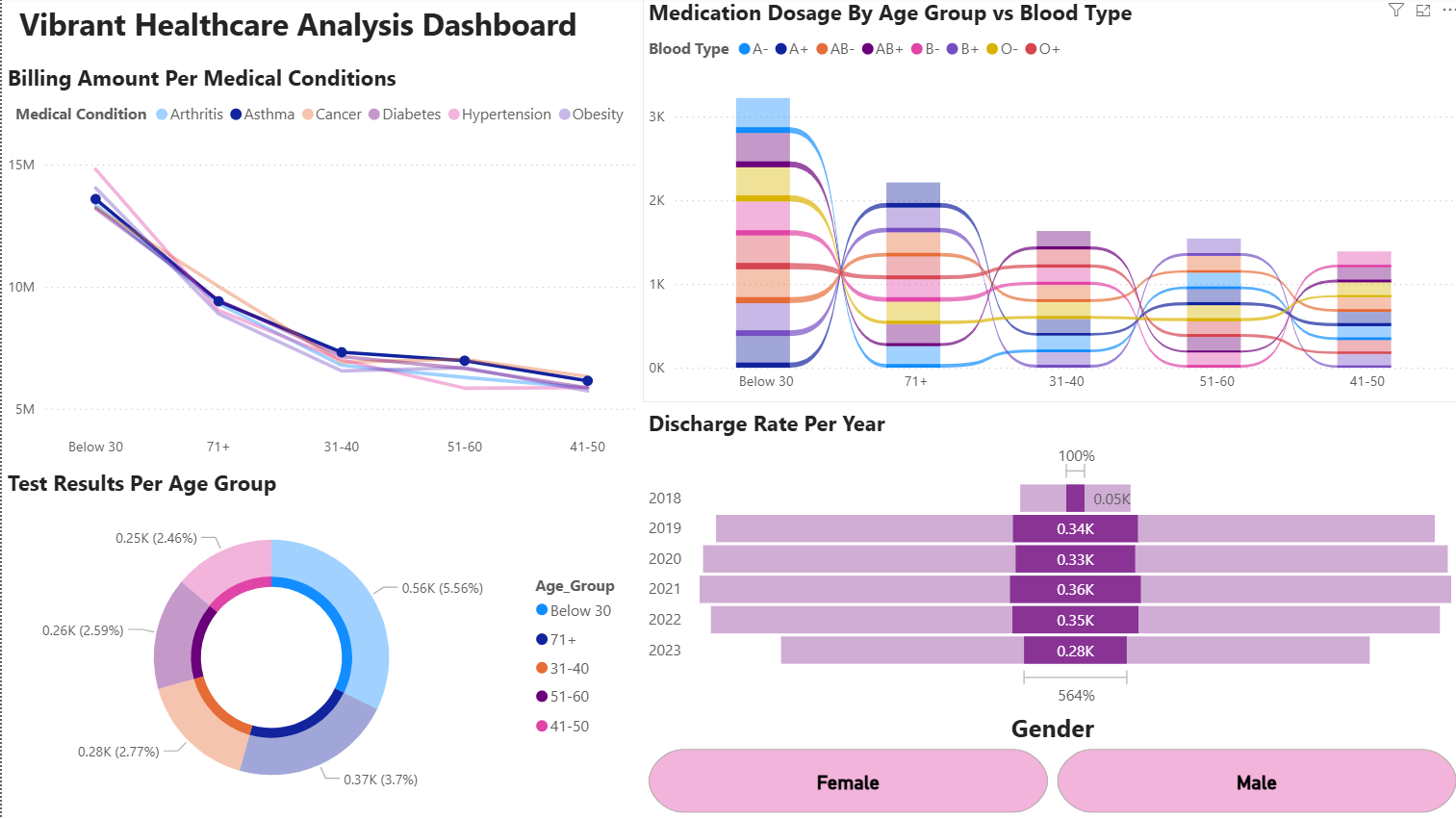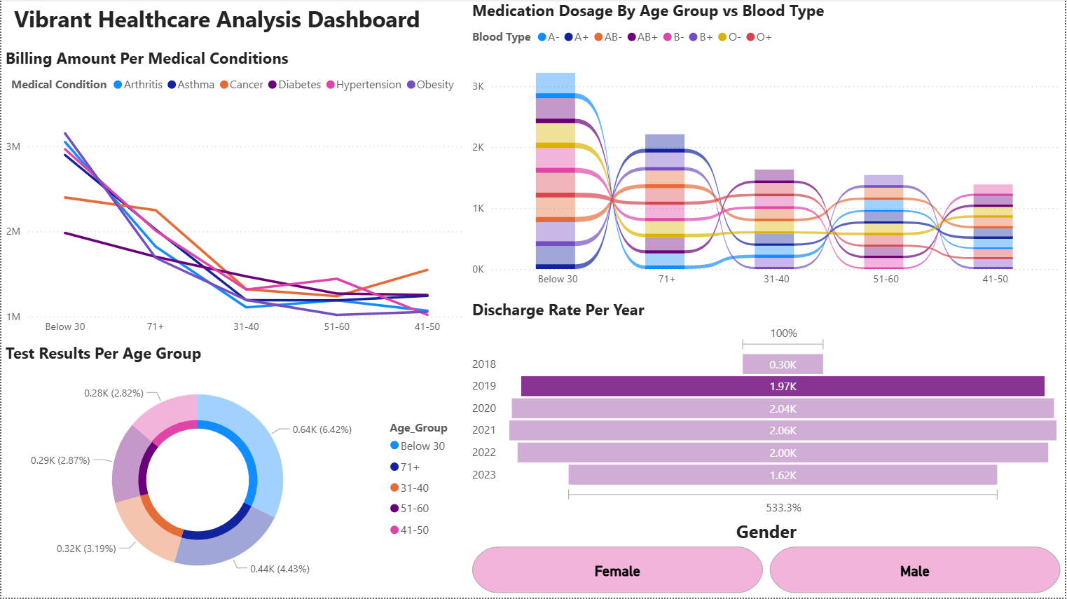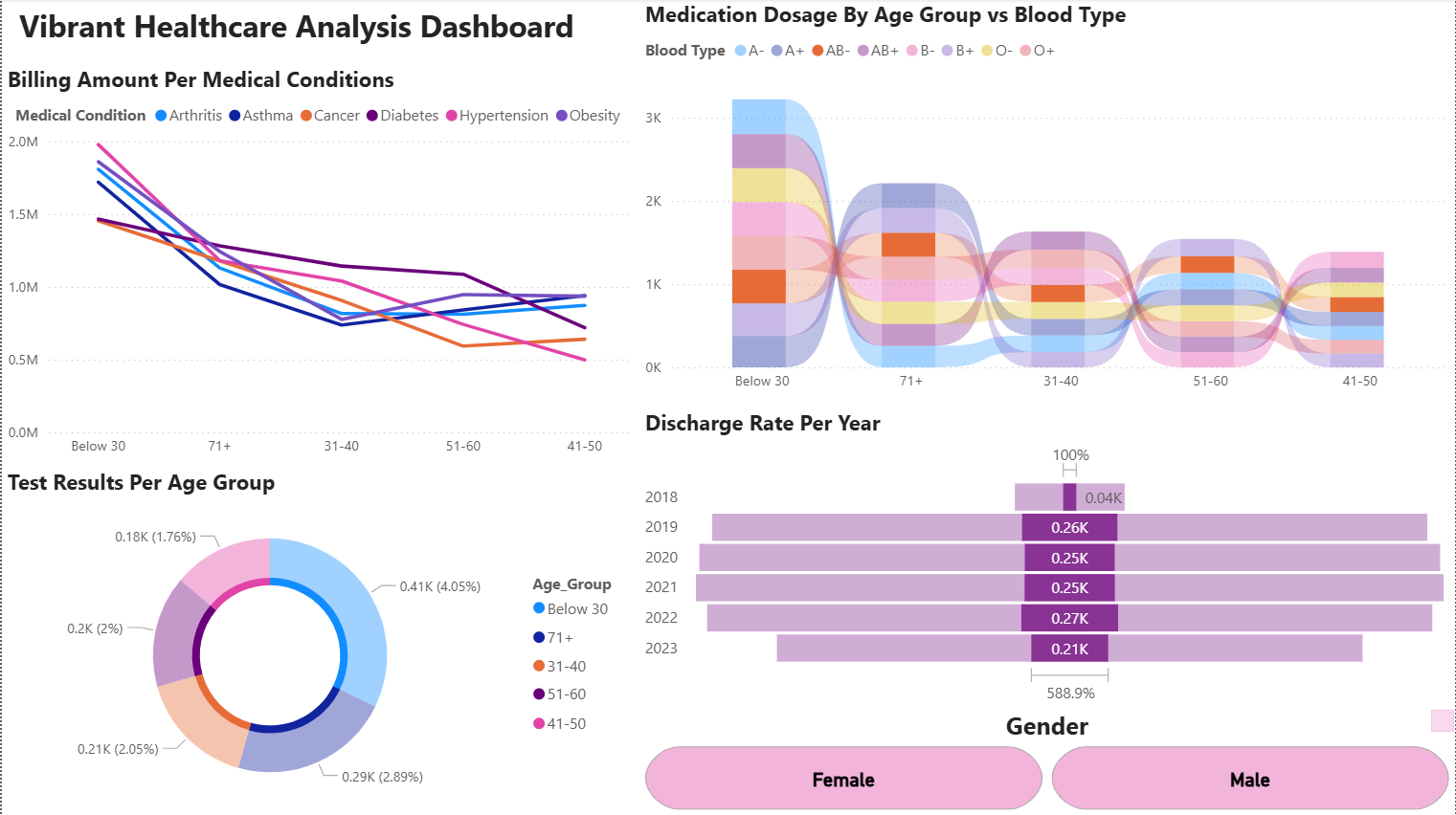 This dashboard and its underlying dataset, which contains billing amounts, sex, blood type, age, and medical conditions, serves as a powerful analytical tool for healthcare facilities. By leveraging these data points, the dashboard provides critical insights into which medical conditions are most prevalent based on billing information, identifies medication usage trends across different age groups, explores correlations between patient gender, blood type, and specific conditions, and tracks the medical records of patients with the highest annual discharge rates. Ultimately, this tool assists healthcare providers in making more informed, data-driven decisions to improve patient care and facility management.
